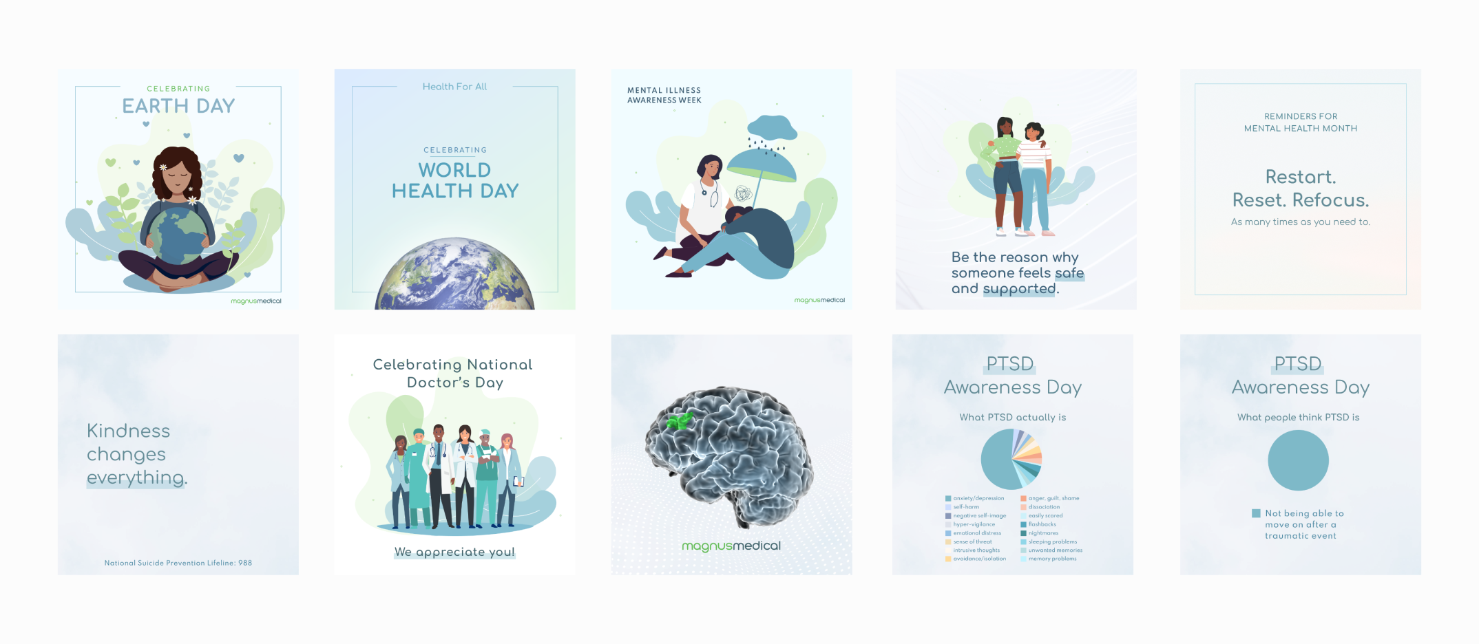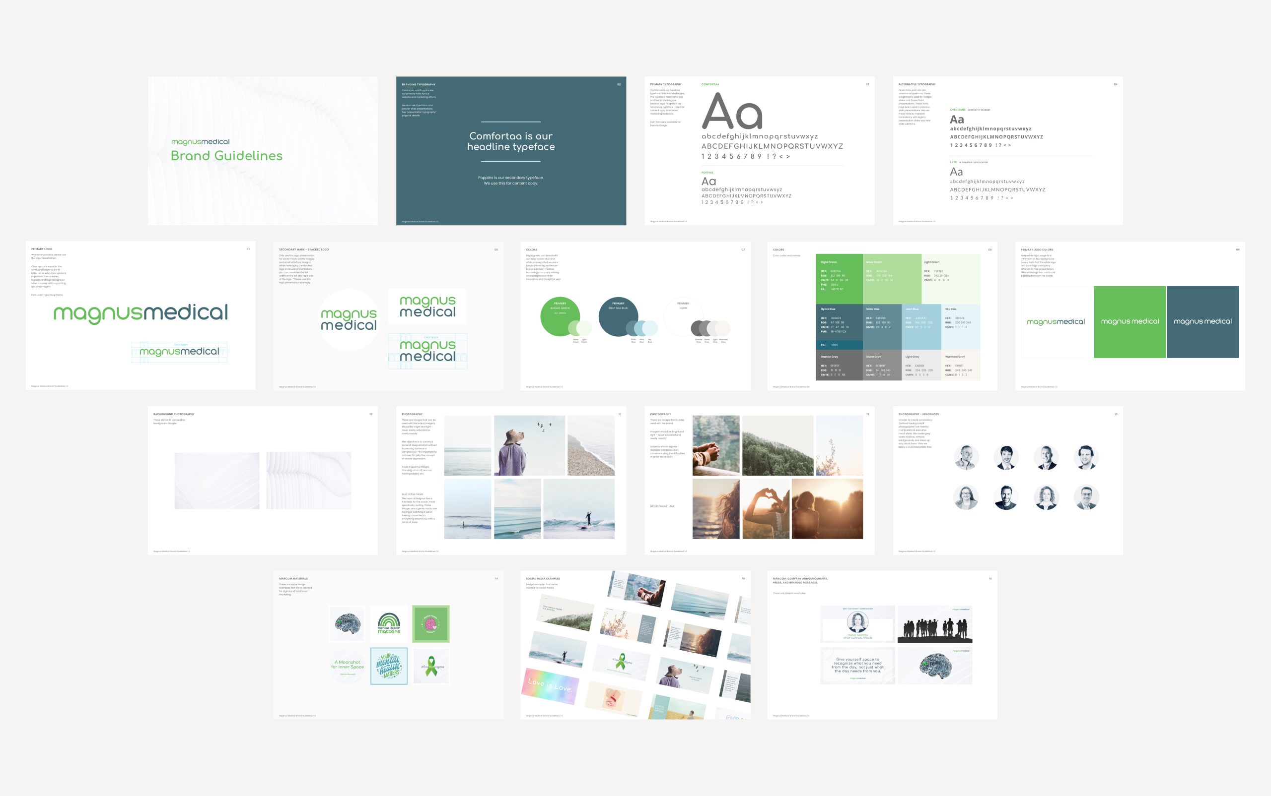 The Magnus Medical palette consists of varying shades, tints, and tones of blue and green. These colors combined with white and earth tones helps convey a forward-thinking, medical technology company that is innovative and thoughtful.